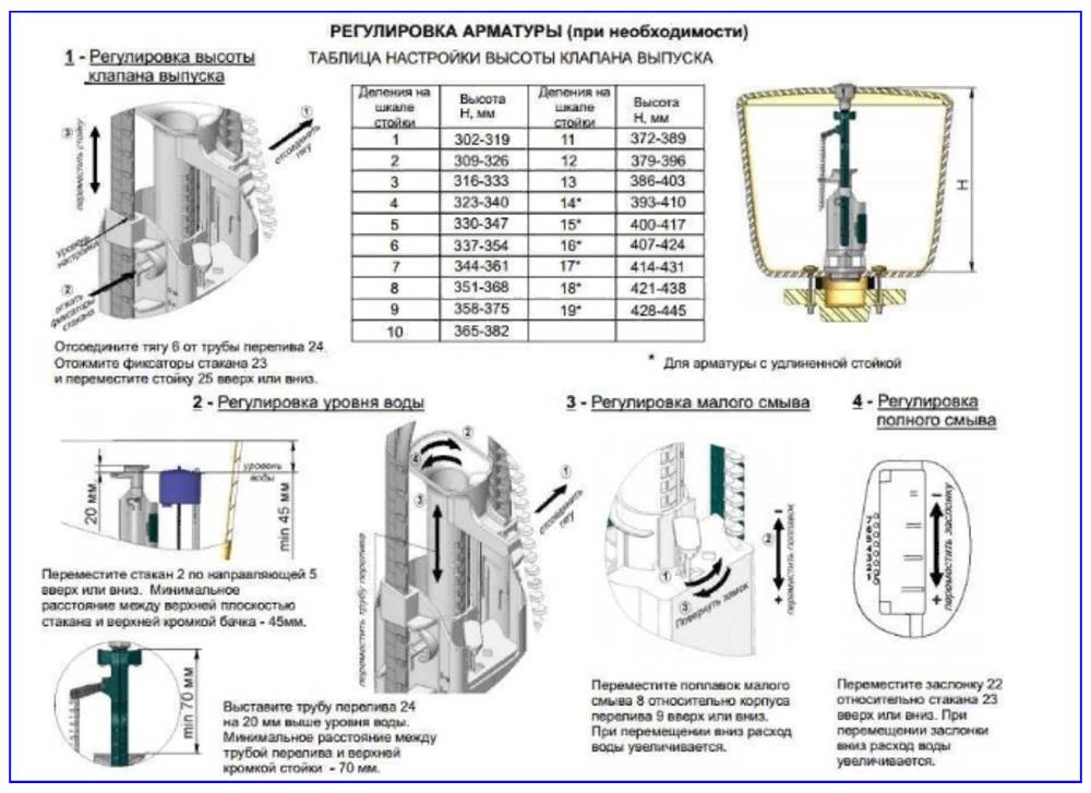 Подстройка перелива и выпускного клапан в таких моделях не предусмотрена, а возникающие с ними проблемы, как правило, приводят к ремонтным работам или полной замене механизмов.
