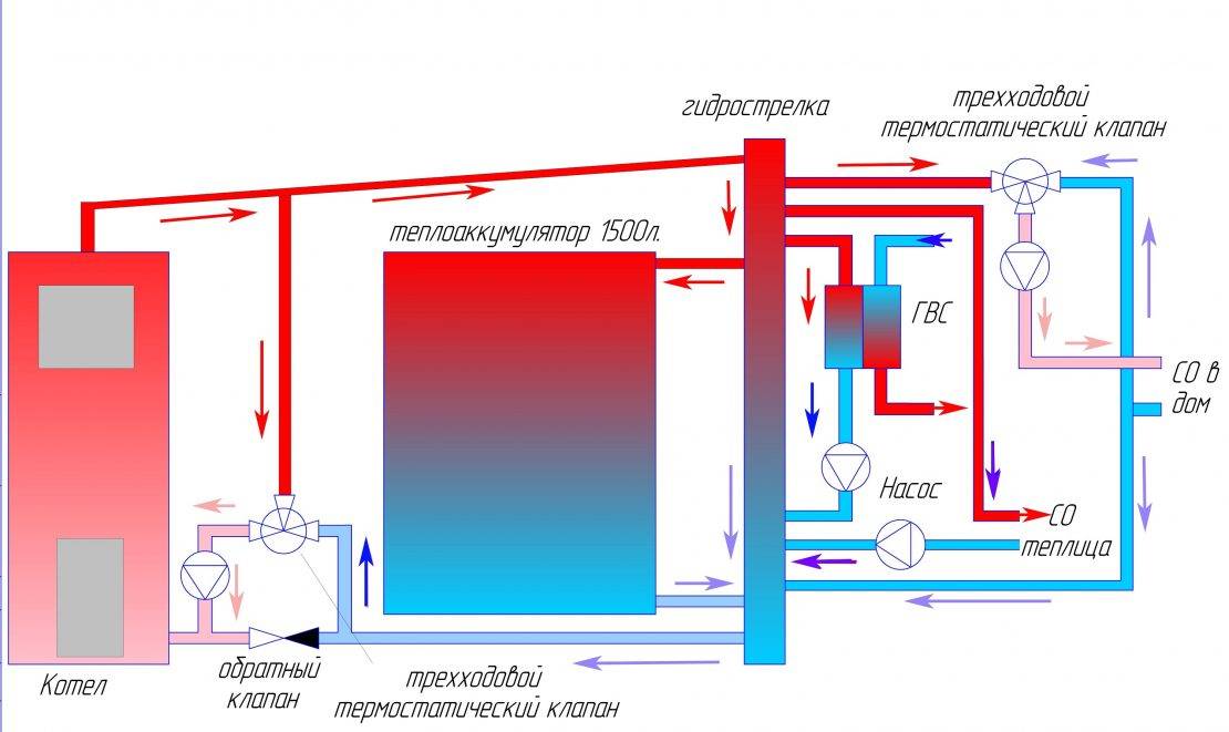 Необходимо помнить что чем дальше от котла находится устройство, тем больший участок трубопровода придется проложить, а это лишние потери тепла. Аккумулятор включается параллельно уходящему их котла трубопроводу. Это делается для того чтобы можно было вывести его из работы. Для этого же в трубопровод врезается вентиль.