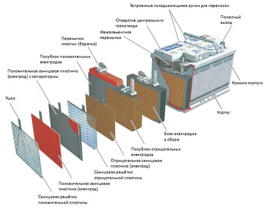 В техническое устройство аккумуляторных батарей включены гальванические элементы (пластины) – химические источники электроэнергии. Их количество составляет 6 штук, они соединены друг с другом последовательно, при помощи перемычек. Один отрицательно заряженный вывод блока крепится к положительному выводу другого.