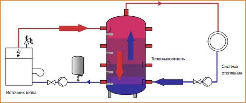 - После прекращения работы нагревательного оборудования нагретая вода попадает в теплоаккумулятор. Причем в сети ее объем замещается не успевшей остыть жидкостью из аккумулирующей емкости.