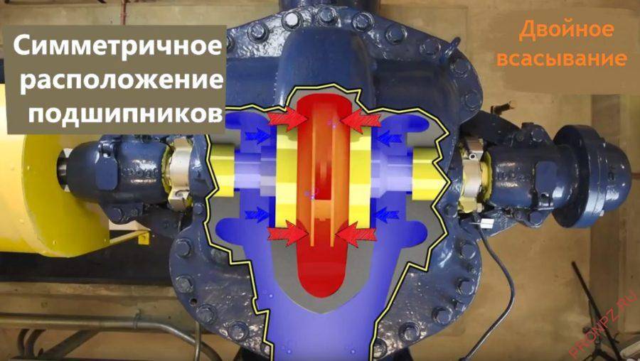 Поддержку вала улучшает не только расположения подшипников с двух сторон, но и возможность использовать симметрические закрытые колеса с двойным всасыванием.