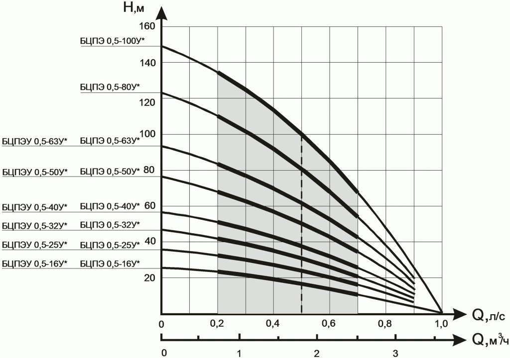 3. Глубинный центробежный насос Водолей БЦПЭ 0.5 — модель с производительностью 0.5 л/сек при том напоре, который указан в обозначении насоса.