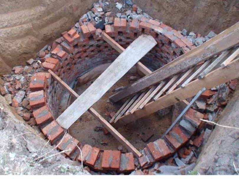 Кирпич для выгребной ямы можно использовать любой, в том числе и БУ. Как было сказано выше, его кладку производят в шахматном порядке с небольшими зазорами, чтобы вода уходила через стенки сливной ямы.