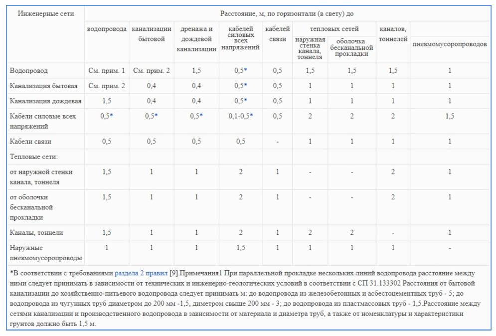 Рис. 10 Расстояния между инженерными коммуникациями по СП 42.13330.2011