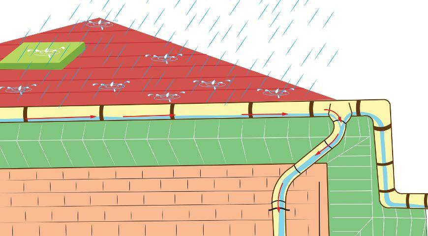 - Желоба, которые принимают на себя все водные потоки с крыши и направляют их в нужном направлении.