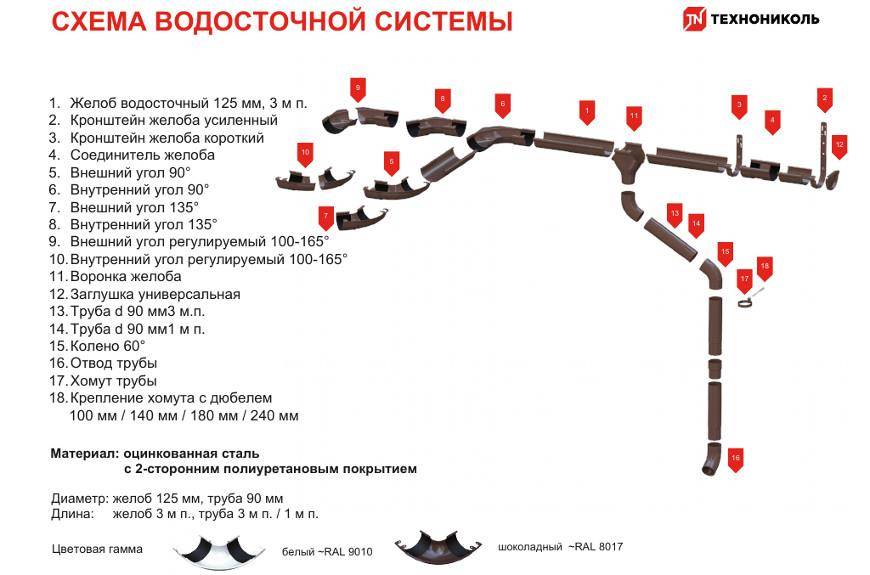 Любая водосточная система состоит из следующих комплектующих элементов: