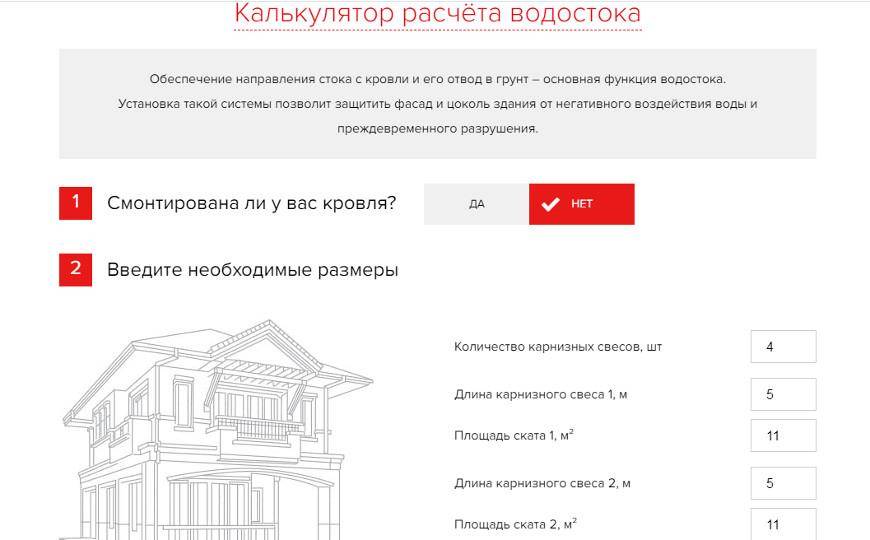 Калькулятор водосточной системы (скриншот с сайта Технониколь)