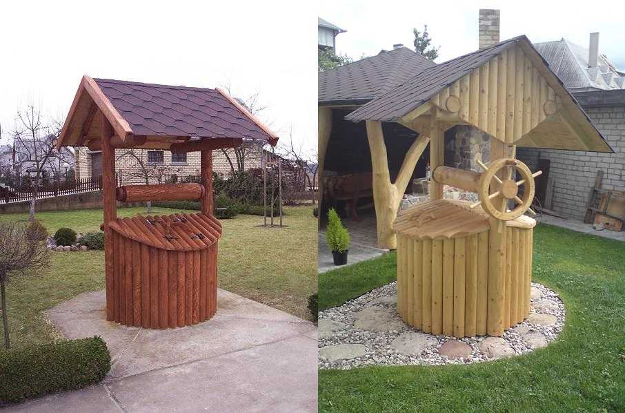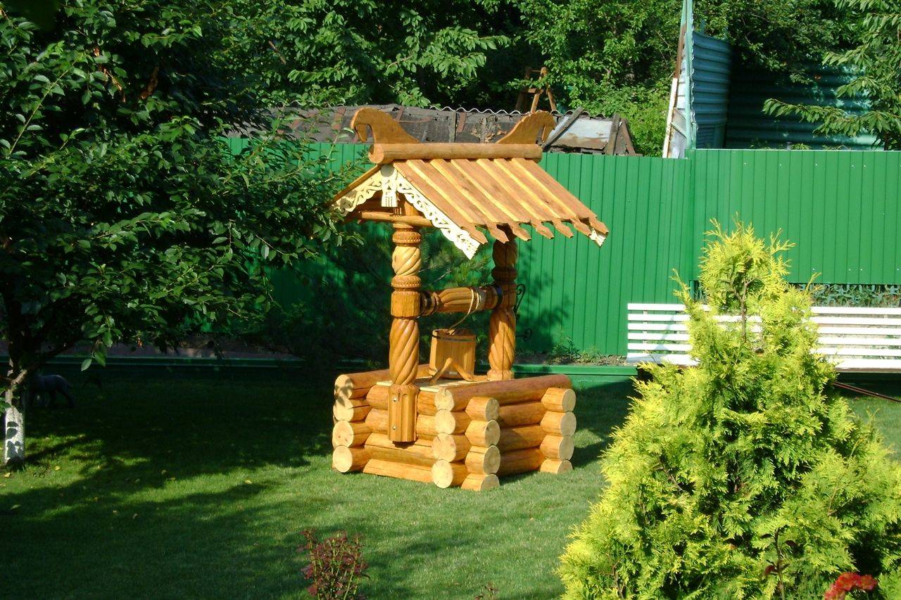 Такая конструкция позволяет стилизовать весь участок под старину – дополнительно поставить деревянную лавочку, фрагмент плетеного забора, декоративную ветровую мельницу и даже телегу. Такой интерьер подчеркнет индивидуальность вашего участка и будет смотреться весьма эффектно.