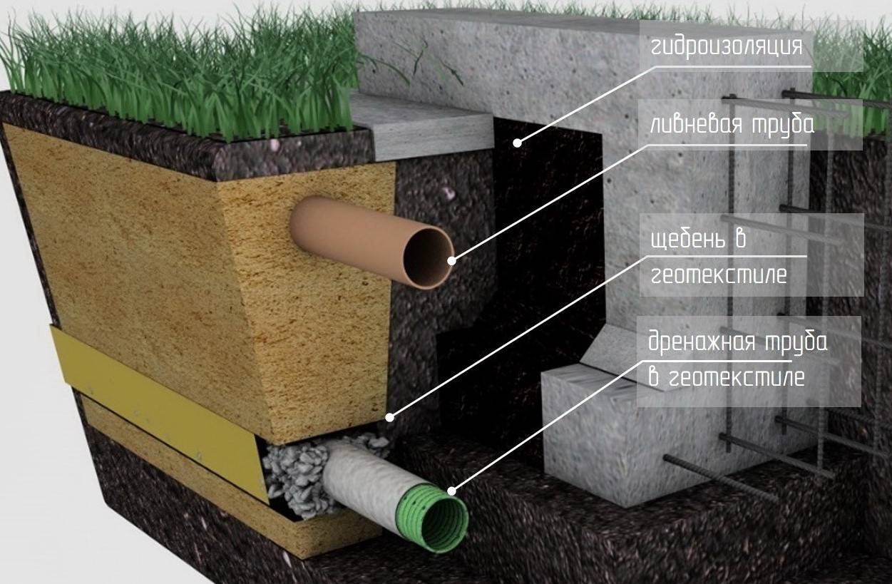 Важный элемент защиты фундамента здания от воздействия влаги — отмостка. Конструктивно — водонепроницаемая полоса, помещенная поверх почвы, на некоторой глубине. Последний вариант — скрытая отмостка.