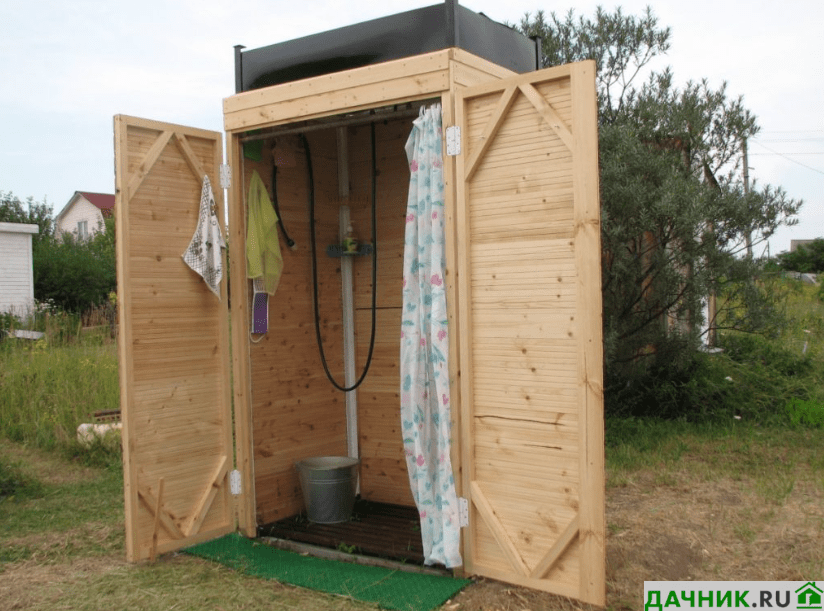 Летний душ состоит из водяного бака, душевой кабинки и поддона. Все остальные «навороты», такие как раздевалка или система подогрева воды, являются необязательными и делаются исключительно по желанию хозяина.