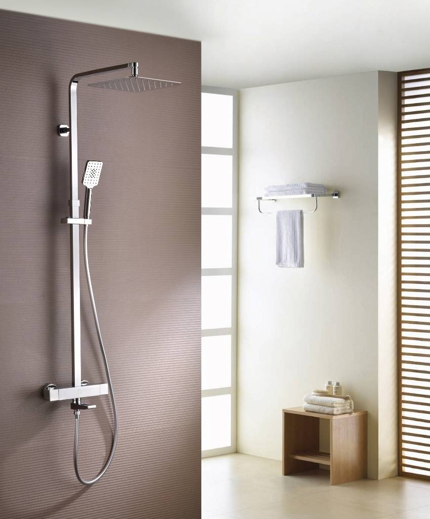 Дело в том, что конструкция душевых стоек очень удобна и эргономична — под душем удобно стоять, не нужно занимать руки лейкой, на штангу при желании крепятся дополнительные полочки и держатели. Можно встроить в душевую стойку даже такое технологичное устройство, как термостат. К тому же установить душевую стойку своими руками совсем не трудно, и справиться с этим в силах каждый — то есть, не приходится тратить лишних денег на оплату работы профессионалов.