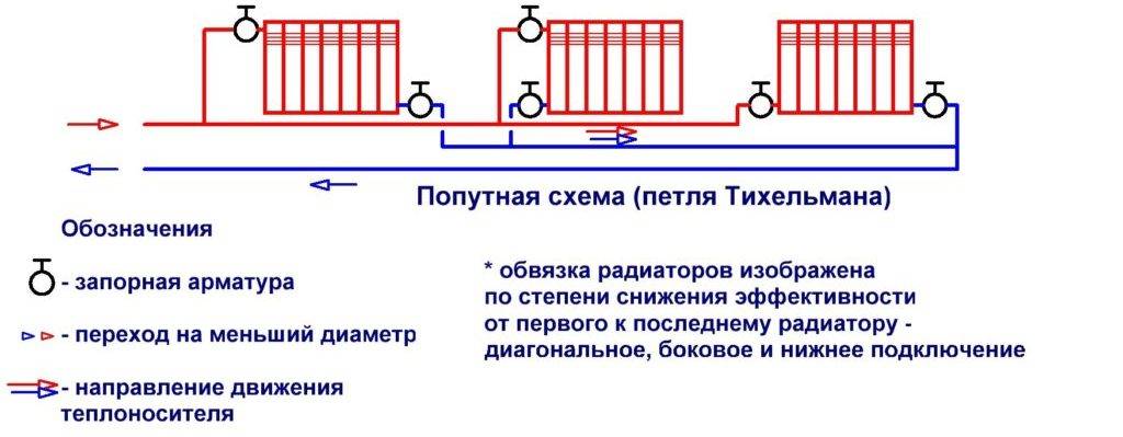 Петля Тихельмана или схема с попутным движением теплоносителя используется в нижней горизонтальной разводке и позволяет скрыть трубы под напольным покрытием или в стяжке. Попутная схема по отзывам монтажников требует минимальной настройки. Петля Тихельмана отлично работает при большом количестве радиаторов, но потребует при этом увеличенного диаметра труб.