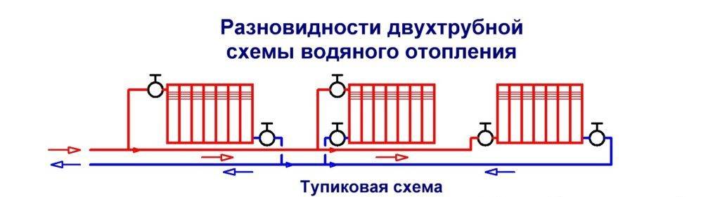 Тупиковая схема монтируется в большинстве загородных домов и имеет ещё одно название – с обратным (встречным) движением теплоносителя. К каждому радиатору подключают подающую и отводящую трубы. Циркуляция осуществляется насосом. Главное преимущество системы заключается в том, что ко всем радиаторам теплоноситель доходит одинаковой температуры, а с помощью регуляторов можно поддерживать необходимый микроклимат в каждом помещении.