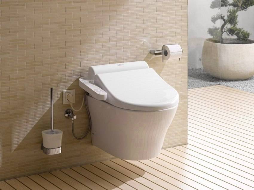 Такой вариант отлично сможет вписаться в интерьер небольших и совмещенных ванных комнат. Аксессуар устанавливают вместо крышки унитаза. Он подключается сразу к водопроводу и к электрической сети.