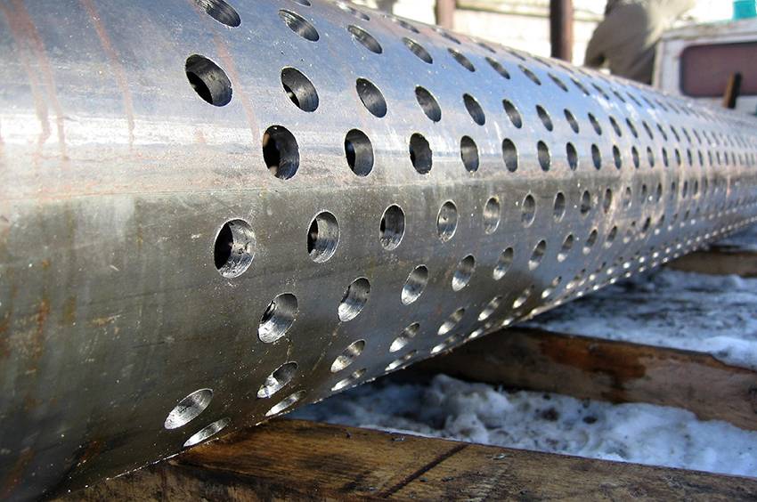Единственный трудоемкий процесс при создании скважинного фильтра – перфорирование. Отверстия проделываются с помощью дрели и сверла под углом в 60°, в шахматном порядке на расстоянии 2-3 см. Перфорация должна занимать четвертую часть трубы. Нижняя часть оборачивается сеткой, которую необходимо прочно закрепить, так как воздействие воды может повредить конструкцию. Сверху труба закрывается пробкой. Проходя через такой фильтр, крупные частицы опускаются в отстойник, мелкие задерживаются сеткой. Максимально эффективно работает такой фильтр для воды из скважины от песка.