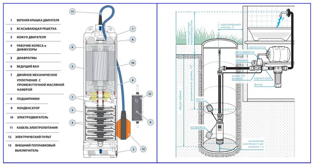 Рис. 7 Устройство поплавкового колодезного электронасоса и схема его подключения