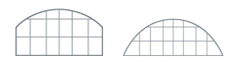 Дугообразные фермы стянуты между собой прямыми балками. Сечение тепличных зданий полукруглое (арочное) или стрельчатое («готическое»).