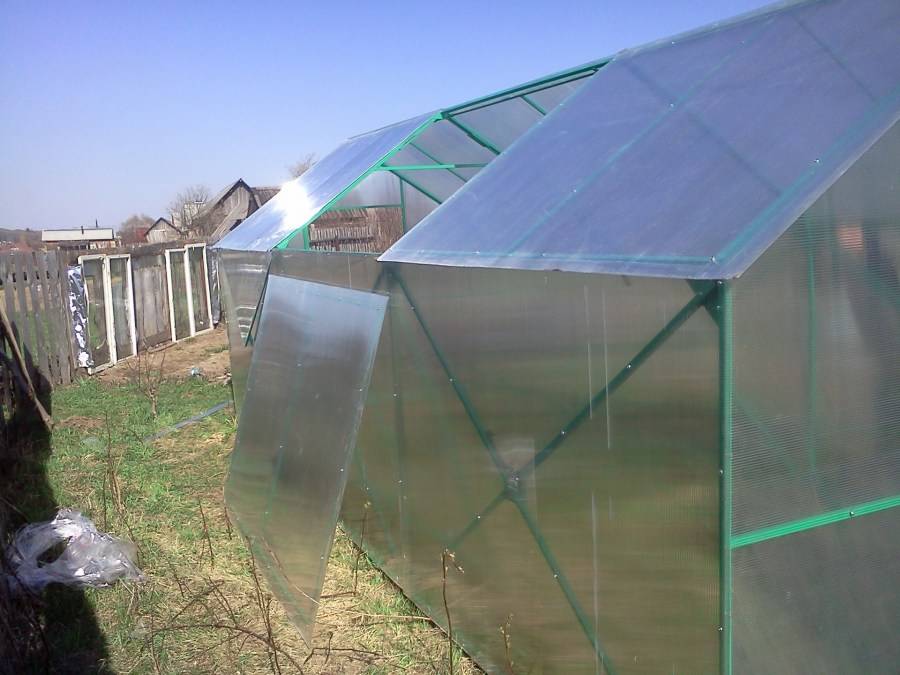 Накройте каркас будущей теплицы листами поликарбоната. Крепите листы с нахлестом 6 — 10 см или встык с помощью специального профиля. Чтобы сделать конструкцию более прочной и долговечной, соединения должны быть выполнены на несущем основании.