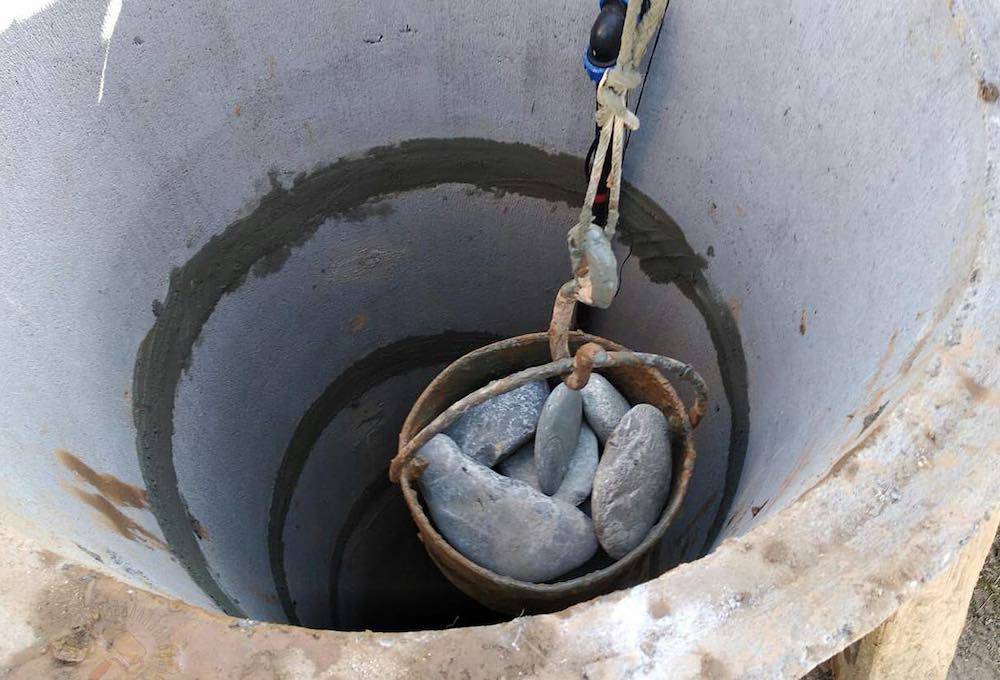 Никакой камень, булыжник или пласт вам не станет помехой. Грунт и все лишнее вынимается из колодца с помощью лебедки.