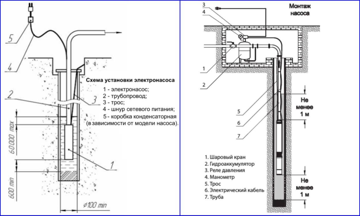 Расстояние всасывающей части насосного агрегата до придонной области зависит от его мощности и конструктивного исполнения. Это значение указывают в самой инструкции на электронасос, где обычно приведена схема его монтажа.
