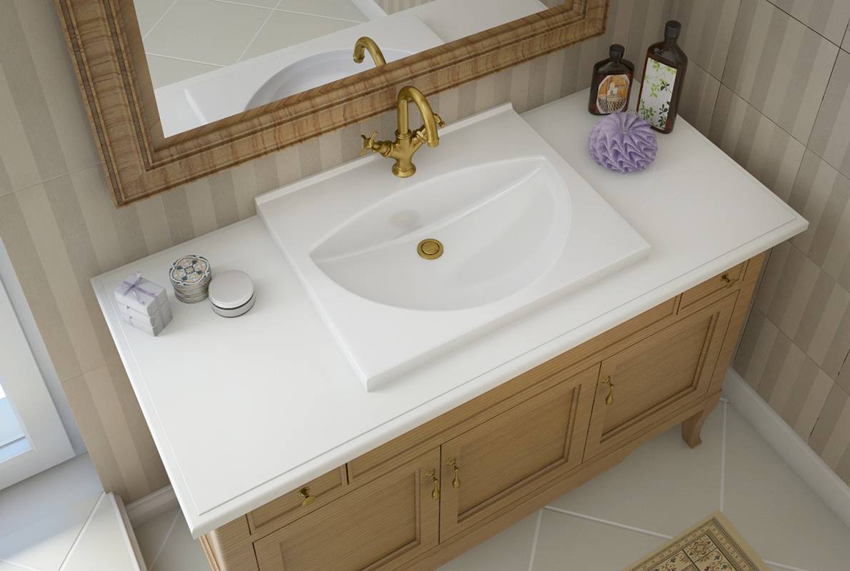 - Верхнее покрытие столешницы применимо для оформления свечами, а также для размещения шампуней, полотенец и других часто используемых банных принадлежностей.