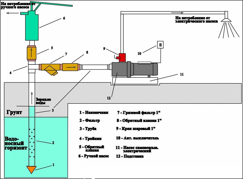 В любом случае надо уменьшить количество механических примесей. Ответственные производители указывают допустимую величину частиц. Но чем их меньше, тем дольше оборудование будет выполнять свои функции без нареканий. Кроме указанных на схеме элементов применяют гравийную подсыпку на дне колодца. Перед фильтром тонкой очистки устанавливают отвод для полива, мойки машин, иных технических нужд.