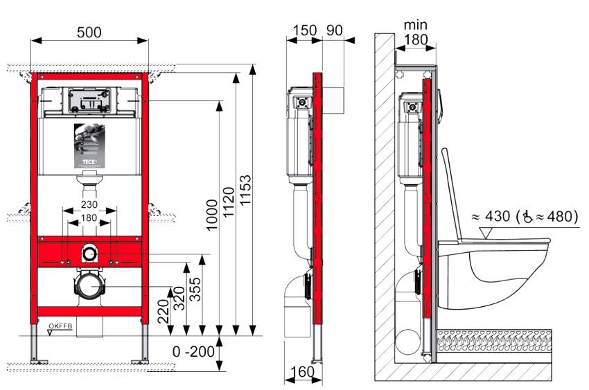 Размеры инсталляций могут быть разнообразные, в зависимости от размеров унитаза, но между собой они почти не отличаются. Чаще всего встречаются инсталляции высотой 112 см, шириной 50 см, на которые крепится и унитаз и бачок.