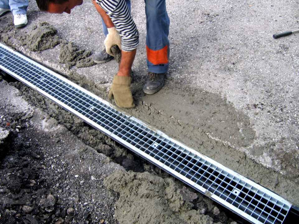 - Установить лотки, дождеприемники и подсоединить их к трубам.