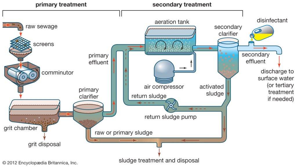 Стоки проходят через решетки, песколовки, жироловки, первичные отстойники, фильтры и септики. - Биологическая очистка.