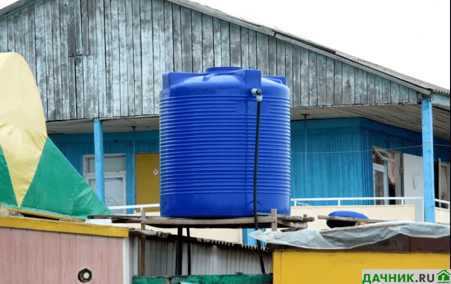 На трубу цепляется специальная занавеска, скрывающая человека от посторонних глаз. Если водопровод на даче отсутствует, то ставится подходящий по размеру бак – это решает проблему с водоснабжением.
