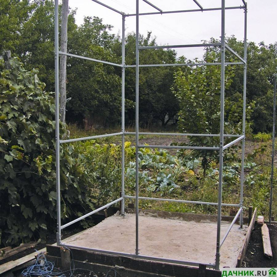 Этот душ получается долговечным, крепким и лёгким. Поэтому многие устанавливают его на дачных и приусадебных территориях. Профильный настил крепится к металлическому каркасу (из профтруб или уголка).