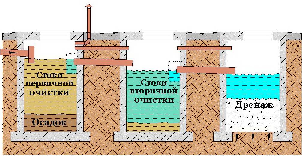 Более совершенна конструкция септика из нескольких емкостей. Стоки поступают в приемную секцию, где естественным образом делятся на тяжелые и легкие фракции, а жидкость перетекает в следующий отстойник. Септик для дачи без постоянного проживания чаще всего и ограничивается двумя колодцами.