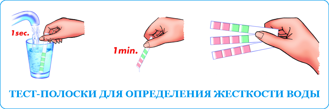 Тесты идут в комплекте с посудомойкой, их можно приобрести в магазинах бытовой химии. Достаточно опустить полоску в воду и через пару минут сравнить рисунок с таблицей, расшифровать. Одну полоску можно использовать только один раз. Для многоразового использования подойдёт портативный прибор TDS-метр.
