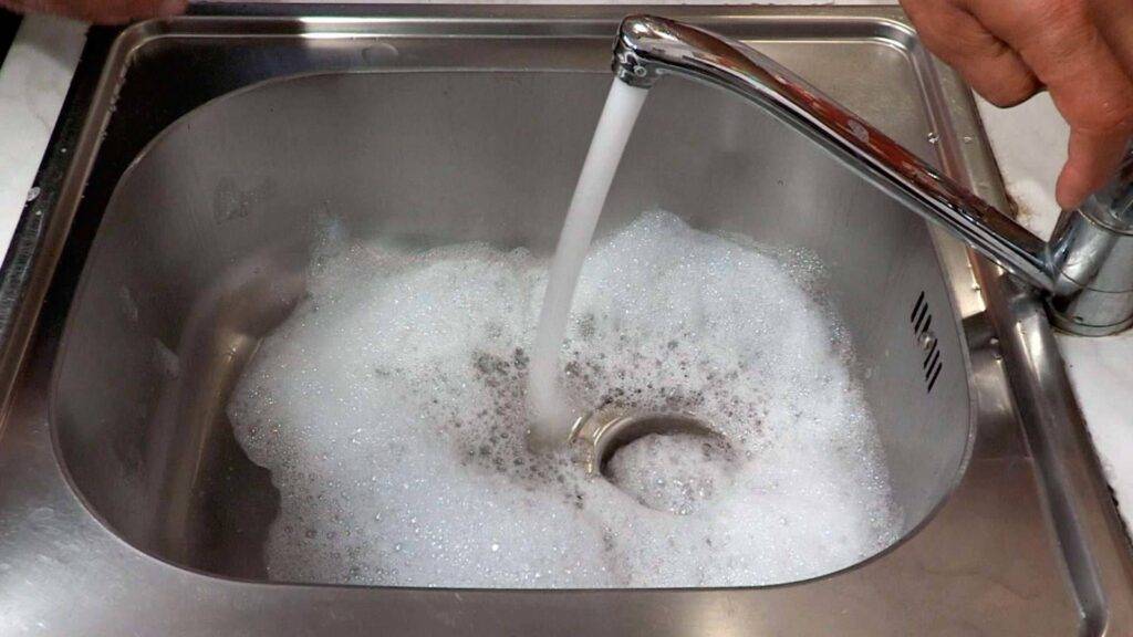 - Ждем 10-15 минут — включаем теплую проточную воду, проверяем насколько хорошо удалось пробить засоры в раковине.