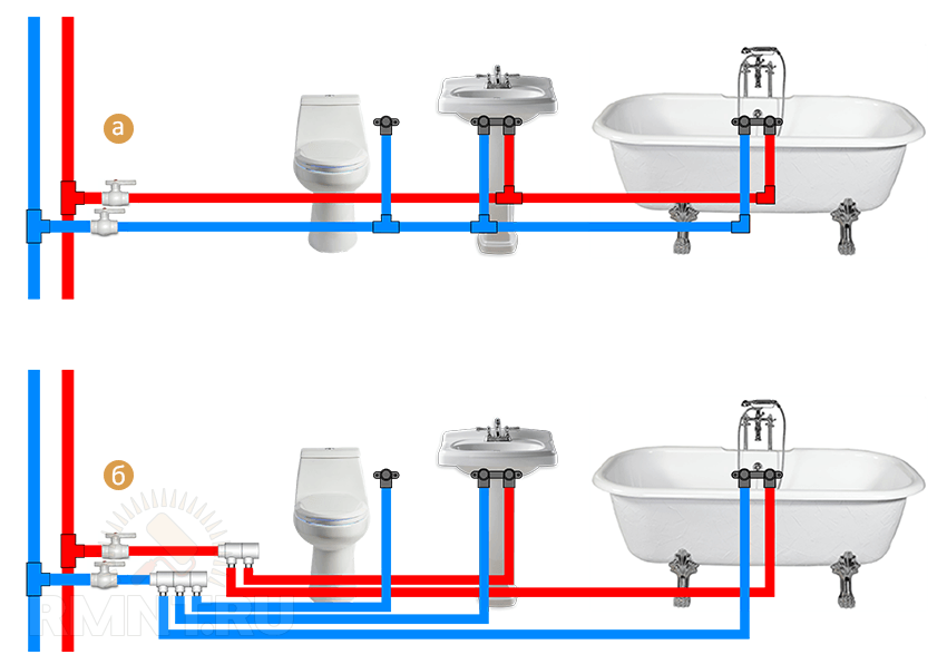Последовательная (тройниковая) разводка труб: 1. Водорозетка для подключения стиральной машины. 2. Водорозетки смесителя раковины.3. Водорозетки на планке смесителя ванной. 4. Уголок. 5. Тройник.6. Обратный клапан. 7. Счётчик горячей воды. 8. Счётчик холодной воды.9. Редуктор давления воды. 10. Фильтр грубой очистки воды. 11. Отсечной кран. 12. Стояк горячей и холодной воды.