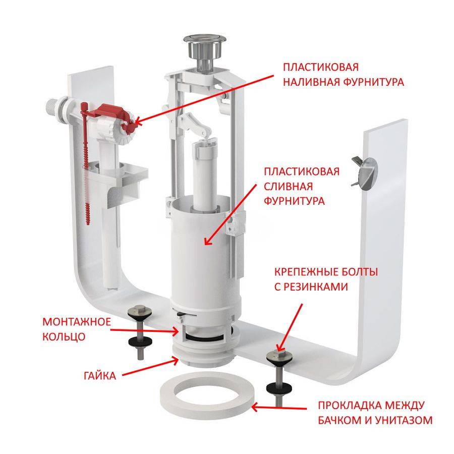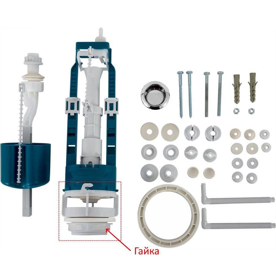 В комплект входит: клапан наполнительный, клапан выпуска, кнопочный узел, комплект крепления бачка и прокладки. В зависимости от типа наполнителя бачка, клапан наполнителя может быть с боковой подводкой и с нижней подводкой. Клапан выпуска может быть одноуровневый или двухуровневый.