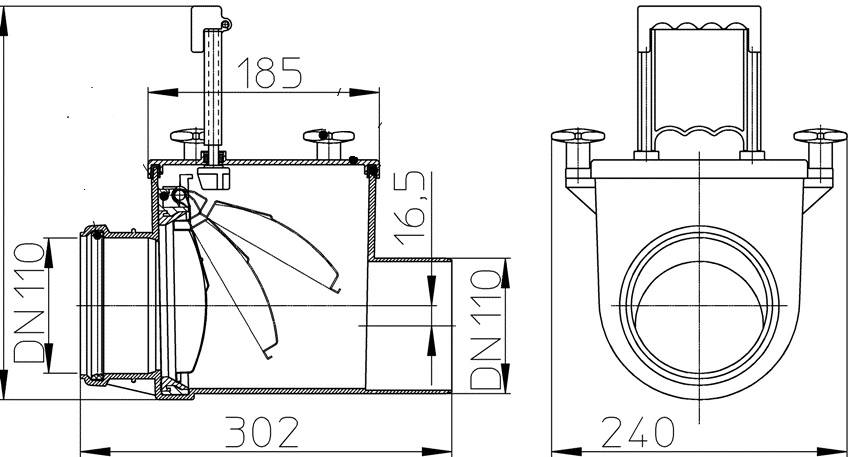 Ось поворота «захлопки» находится выше проходного отверстия. Под действием напора «захлопка» откидывается и не препятствует прохождению воды.
