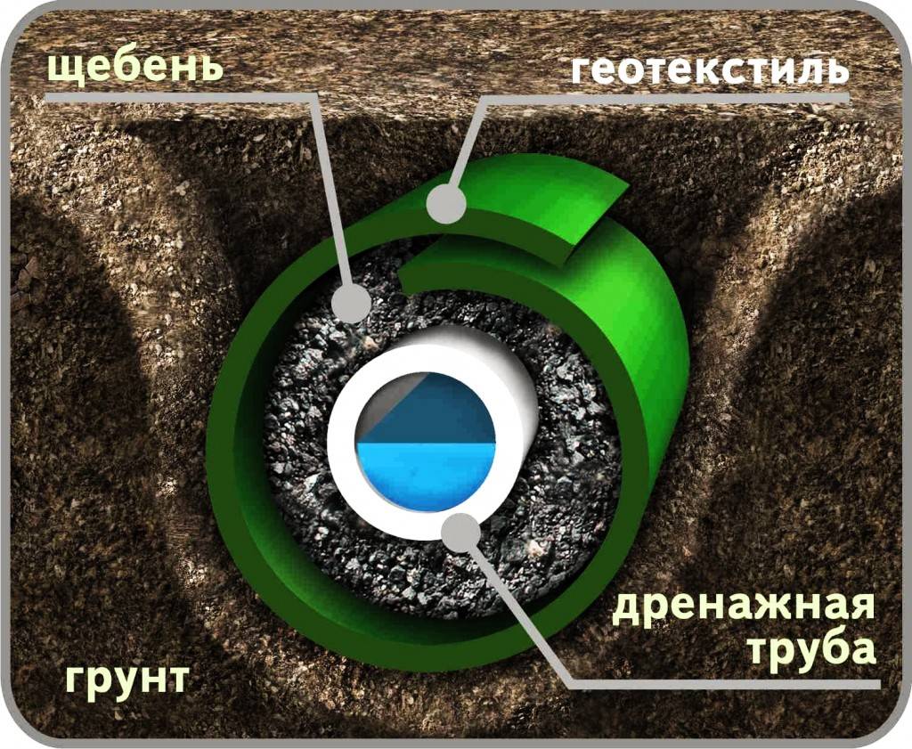В устройстве закрытой дренажной системы используются дренажные трубы с перфорацией, геотекстиль и засыпные материалы: песок, гравий, щебень (+)