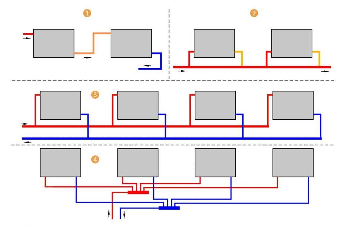 Однотрубное отопление предполагает последовательную схему монтажа труб и батарей. При его эксплуатации вода будет проходить по ним последовательно. Имеется два способа установки оборудования: