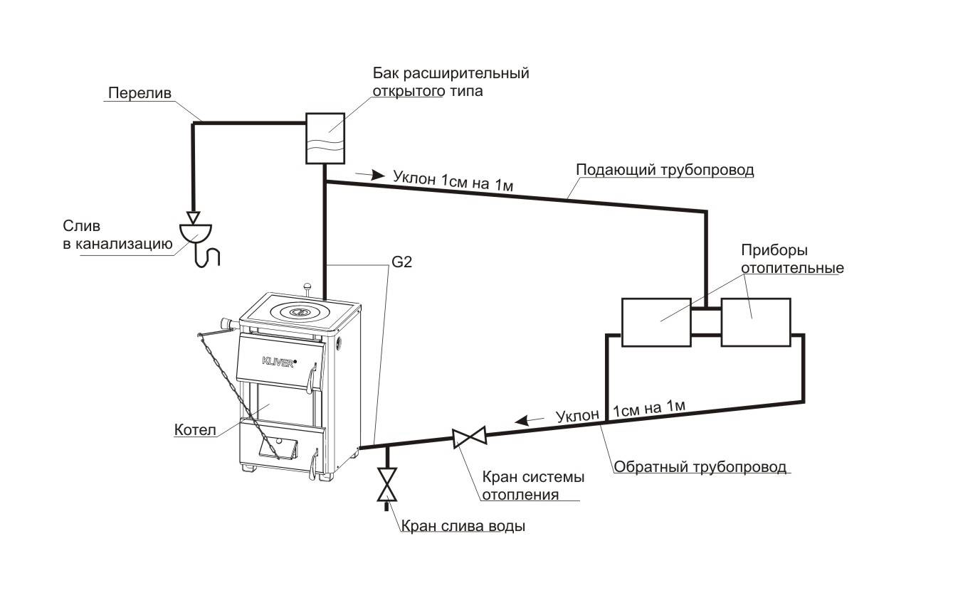 Расширительный бак устанавливается максимально высоко, на чердаке, который не отапливается. Бак открыт, обеспечен постоянный доступ кислорода. Постоянный контроль за уровнем бака позволяет предотвратить воздушные пробки в трубопроводе. Необходимо следить за медленным нагреванием воды, так как циркуляция воды происходит медленно. Если довести температуру до максимальной (точка закипания) – есть риск быстрого износа всей системы отопления. Если не используете отопление зимой – необходимо сливать теплоноситель для сохранности труб, радиаторов и котла.