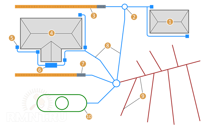 Совет! При проработке схемы учитывайте прокладку других коммуникаций и трубопроводов на вашем участке. Они не должны мешать друг другу.