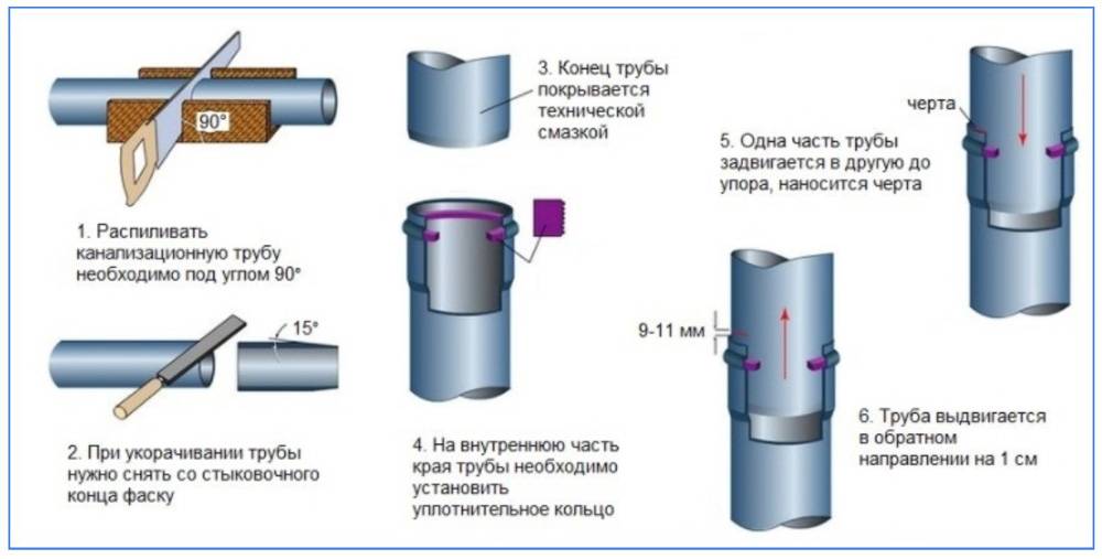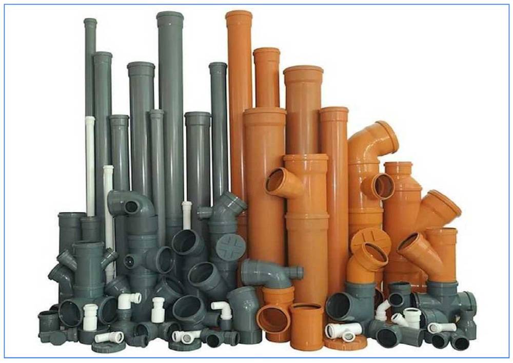 Для прокладки внутренней канализации используют трубы из поливинилхлорида (ПВХ) или полипропилена (ПП) серого цвета наружными диаметрами 110 и 50 мм с небольшой толщиной стенки (2 – 3 мм). Трубопровод монтируют посредством раструбного соединения, вставляя конец одной трубы в расширенный патрубок другой, имеющий внутреннее резиновое уплотнительное кольцо.