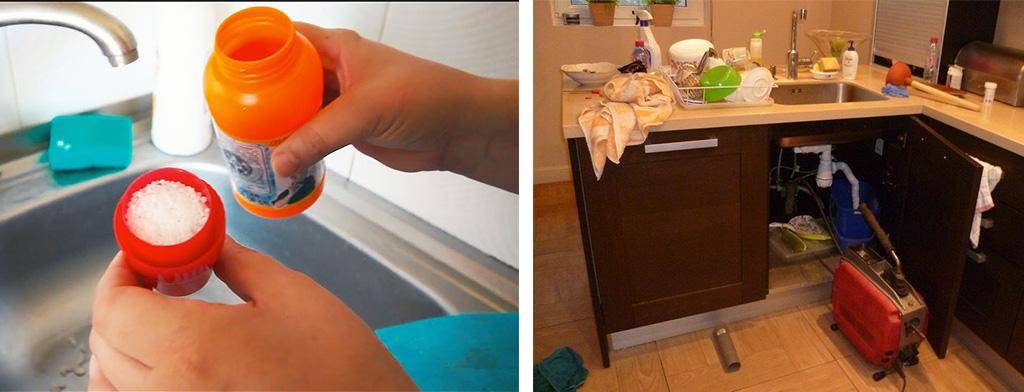 Если засор небольшой, его можно продавить при помощи вантуза. Если не помог вантуз, можно воспользоваться тросом с ручкой-коловоротом. Такой трос вращательно подается в трубу канализации, и за счет таких движений (вкручивания) проходит все колена и повороты системы. При помощи бытовой химии борются с особо устойчивыми засорами. Для очистки труб существует множество химических и биологических препаратов, которые разъедают грязевые пробки