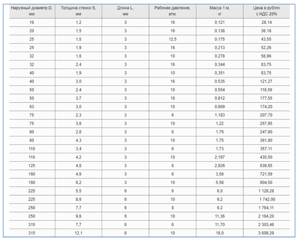 Размерные параметры Dn. Трубы изготавливают стандартных диаметров для водопровода и канализации от 6 до 630 мм, наиболее популярные размеры 16, 20, 25, 32, 40 50, 63, 75, 90, 110, 125, 160 мм. Соответственно толщина стенки изделий зависит от их габаритных размеров и лежит в диапазоне от 1,2 до 6,2 мм для указанных выше ходовых размеров. Стандартная трубная длина в зависимости от производителя — 3 или 5 метров.