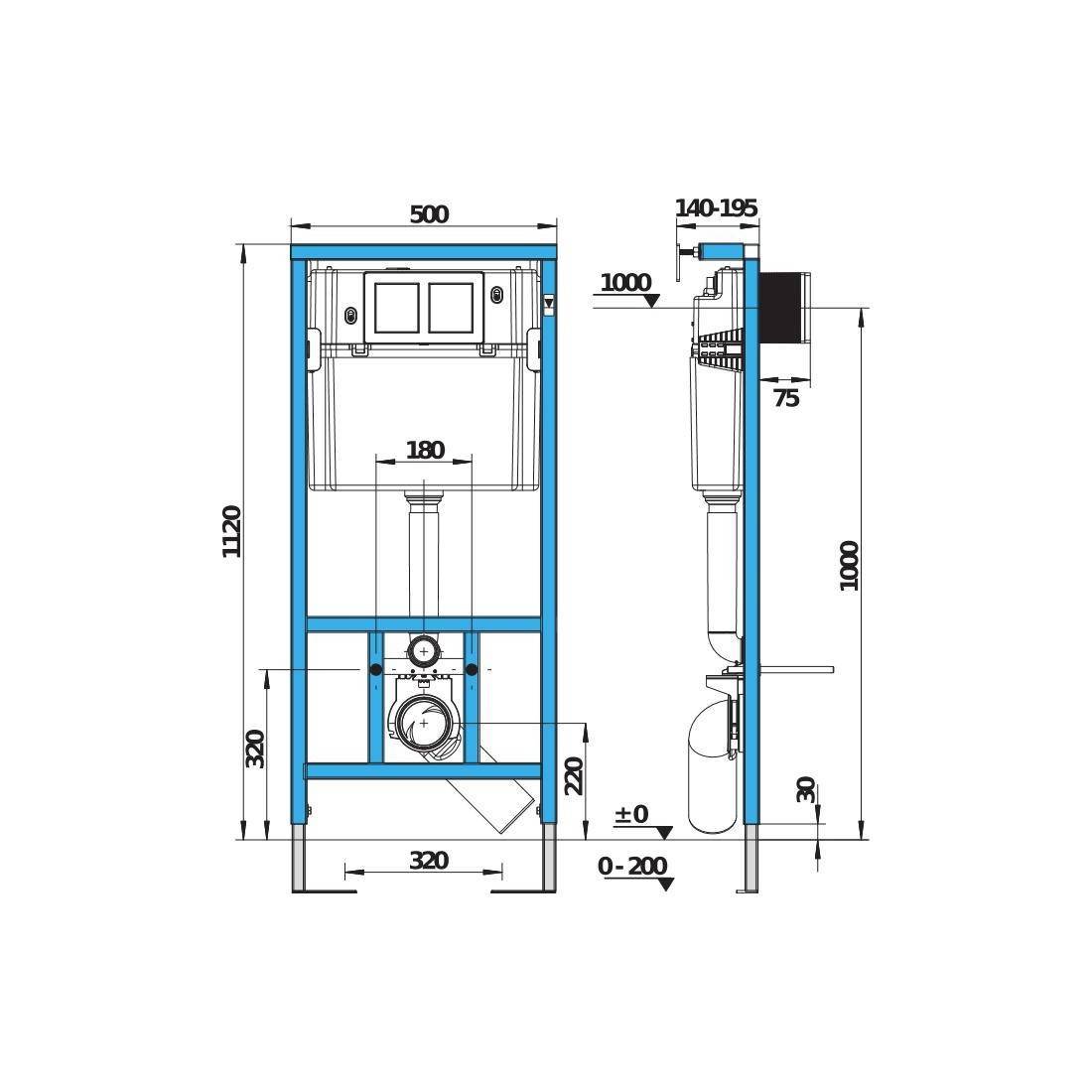 Российско-польская система инсталляции с выдвижными фиксируемыми ножками – можно регулировать высоту установки. Фронтальная смывная клавиша, бачок с защитой от конденсата. Тип подвода воды – справа и слева. Механический слив с двумя кнопками. Инсталляция крепится в капитальную стену.