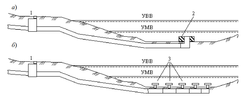 Рисунок 25 – Схемы русловых выпусков: а – сосредоточенный; б – рассеивающий; 1 – береговой колодец; 2 – бетонный оголовок; 3 – оголовки с насадками