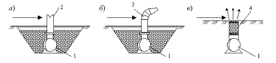 - конструкции: затопленные, незатопленные, сосредоточенные, рассеивающие и эжекторные.