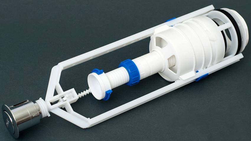 - сливной механизм. Устройство, соединенное с кнопкой, отвечает за слив воды. В нижней части механизм слива оснащен герметичной мембраной, защищающей от образования протечки воды в унитаз;