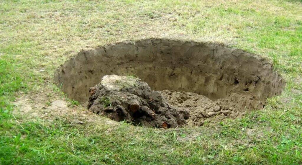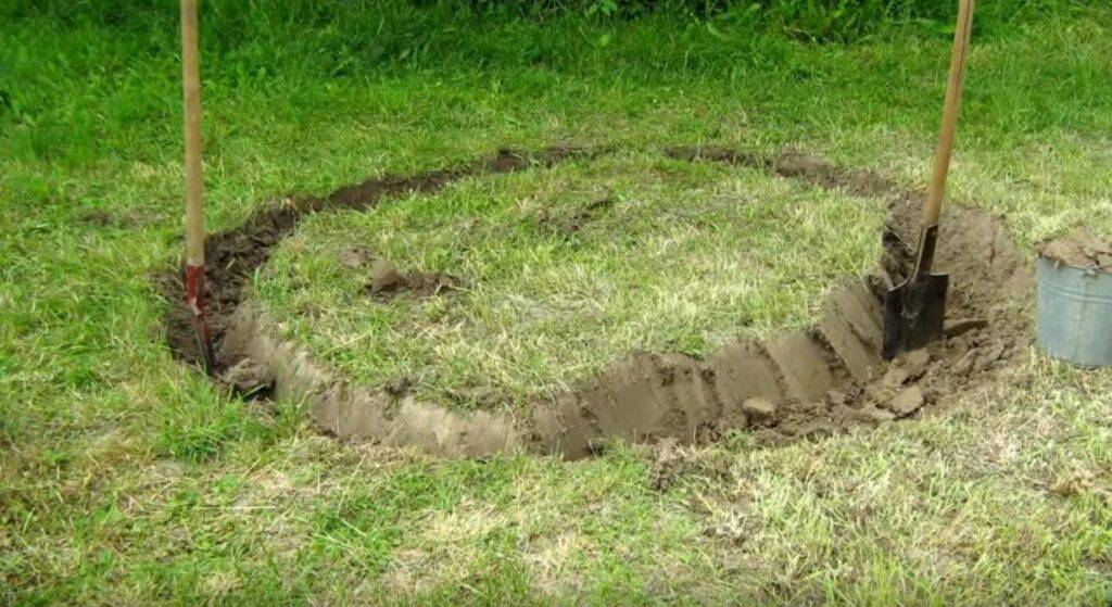Лопатами вырыть котлован под септик. Чем больше его глубина — тем лучше. При выборе глубины нужно учитывать высоту залегания грунтовых вод.