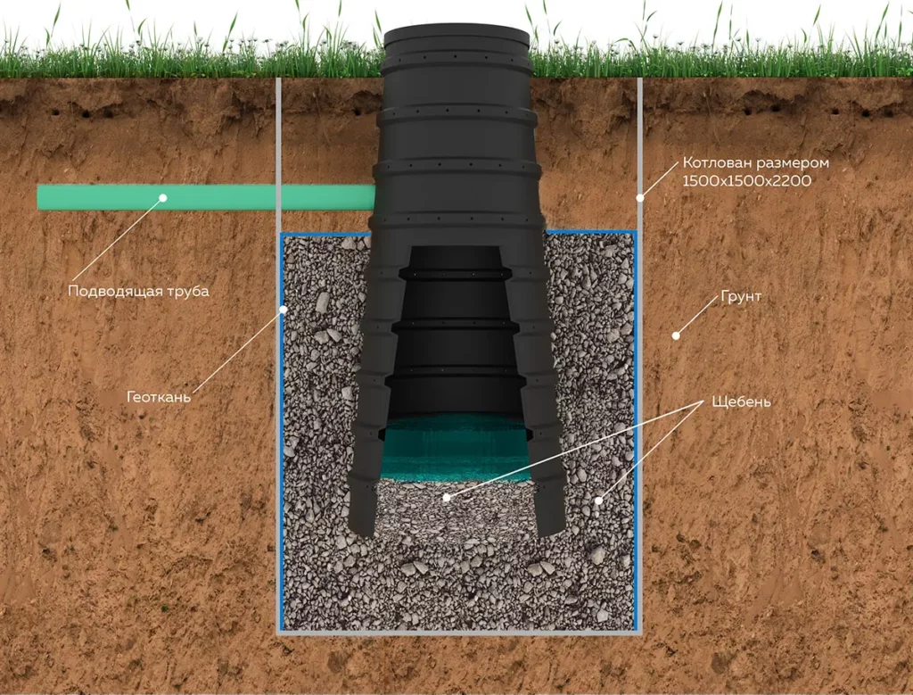 Конечный резервуар не имеет днища — он называется фильтрационным колодцем. Назначение этого узла — впитывание осветленной воды в грунт для почвенной доочистки.